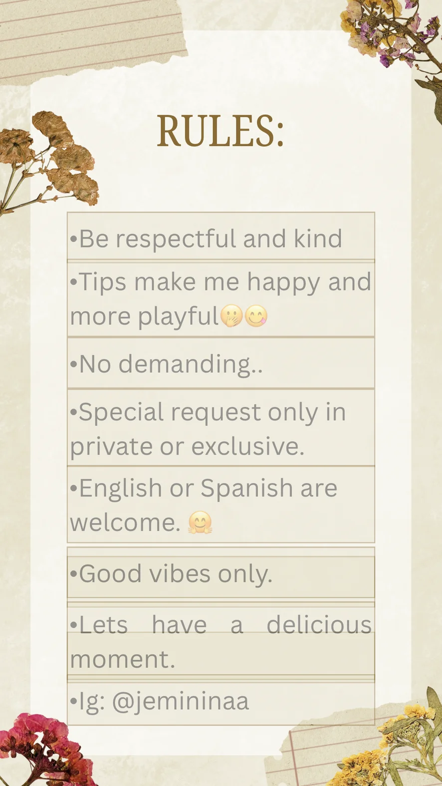 Спанкінг, Еротичні танці, Мастурбація пальцями, Дилдо або вібратор, Глибоке горло, Іграшки для сосків, Між грудьми, Олійне шоу, Топлес, Тверкінг, Камшот, З дупи до рота, Брудні розмови, Фут-фетиш, Демонстрація геніталій, Секс-іграшки, Мастурбація, Мастурбація рукою, Сквірт, Анал, Анальні іграшки, Мінет, Оргазм